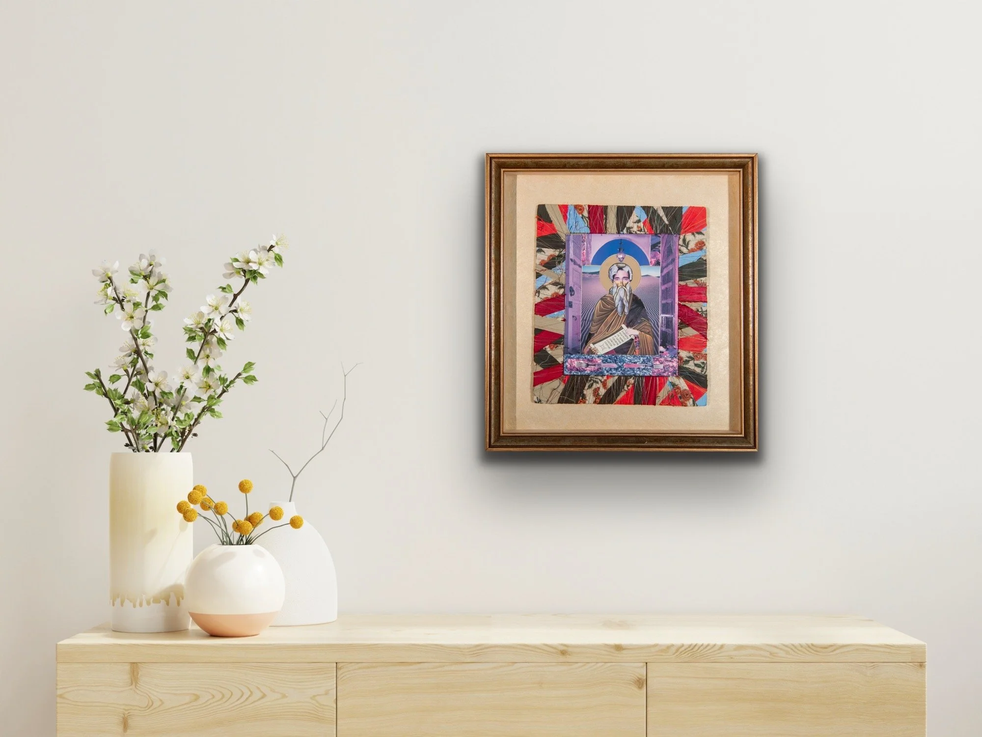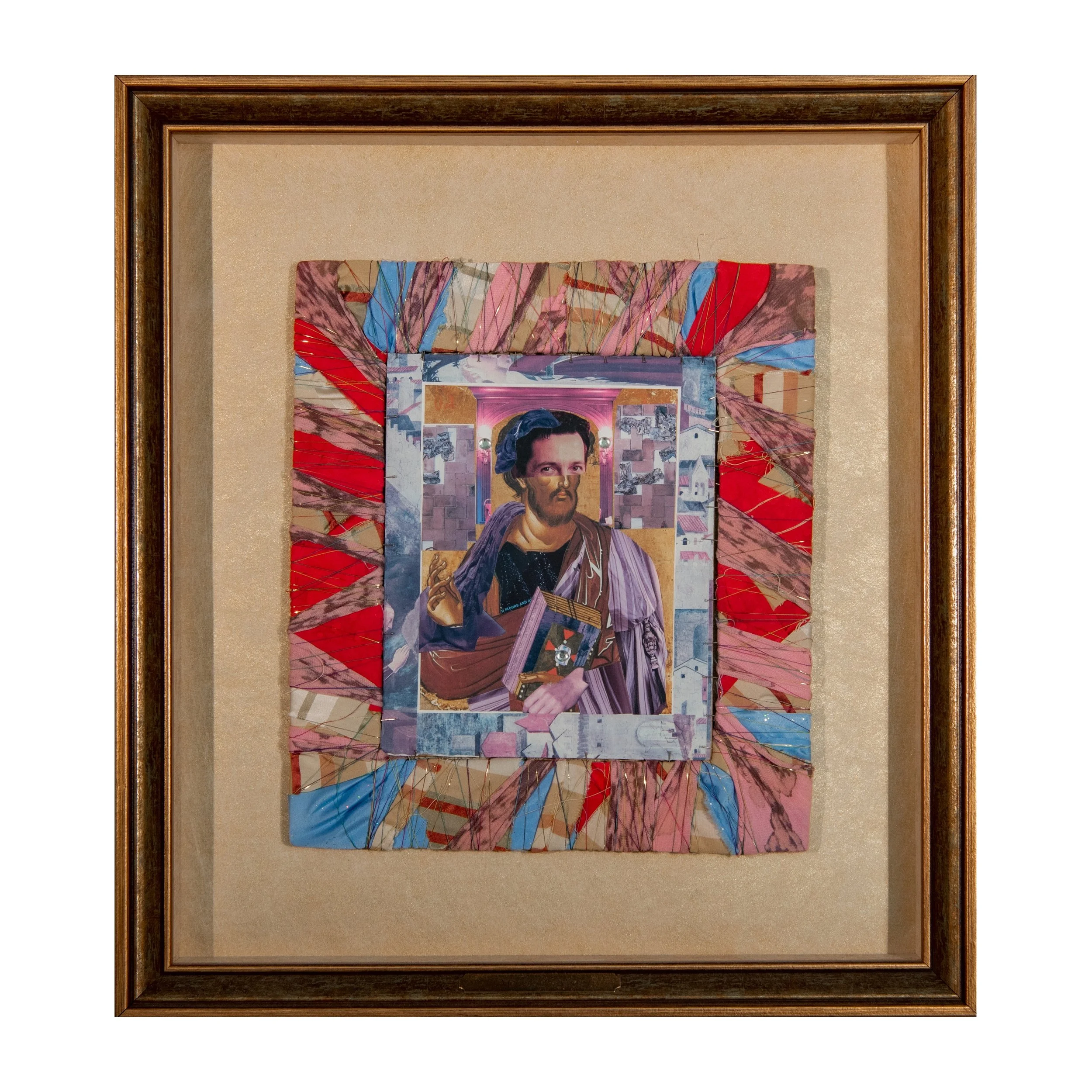 Faye’s icons spawned from her need to express her adoration for the Saints while also spending creative time with her young daughter who was learning about them. Instead of pouring herself into paintings, she decided to cut out elements from old print ads that told the story of the Saints and then make canvases that question what it means to be an icon in the Western world.